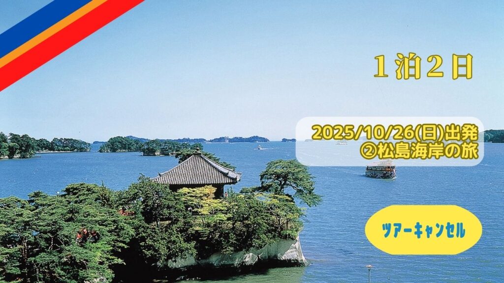ホテル8:30…<徒歩>…松島遊覧船(乗船/松島湾周遊コース)9:00–*乗船約50分間………瑞巌寺・五大堂など(散策)……松島さかな市場(昼食・買物)11:45-13:10=<高速道>=東信各地(佐久→上田) 19:20-20:30頃