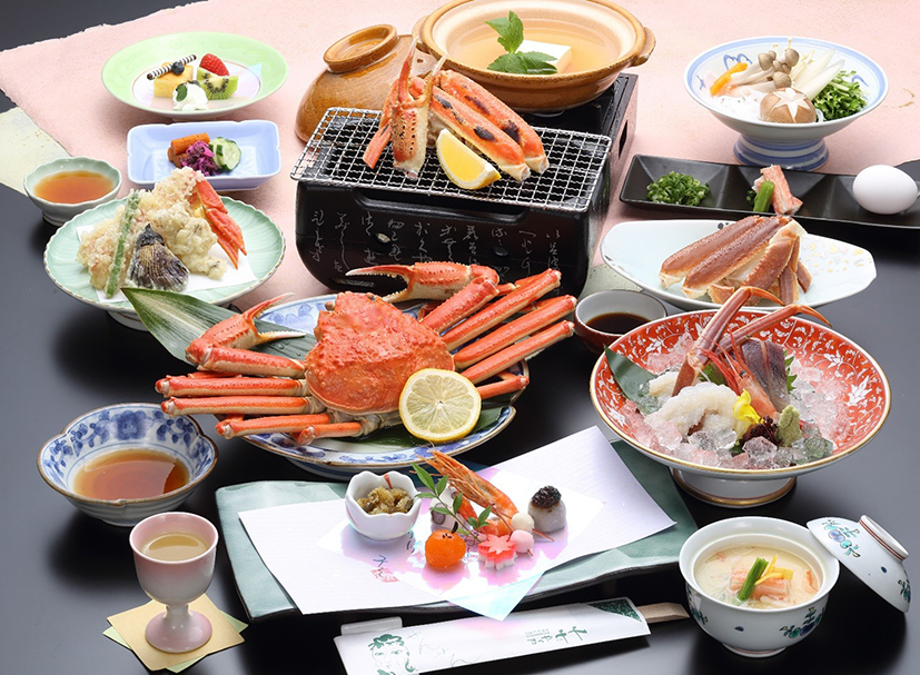 *夕食 蟹づくし会席:かに刺し・蟹鍋・焼き蟹・かに天ぷら・かに茶碗蒸し等