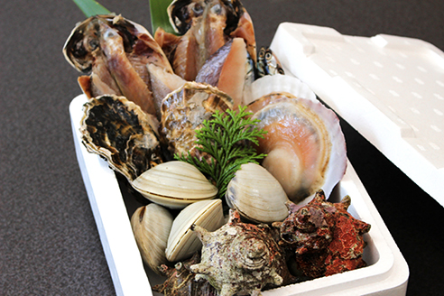 海産物詰め放題:カニ、サザエ、牡蠣、ホタテ、ホンビノス貝、海老、ひもの、切り身など約 10 種の海産物を発砲スチロールに詰め放題チャレンジ体験です。(保冷剤付)