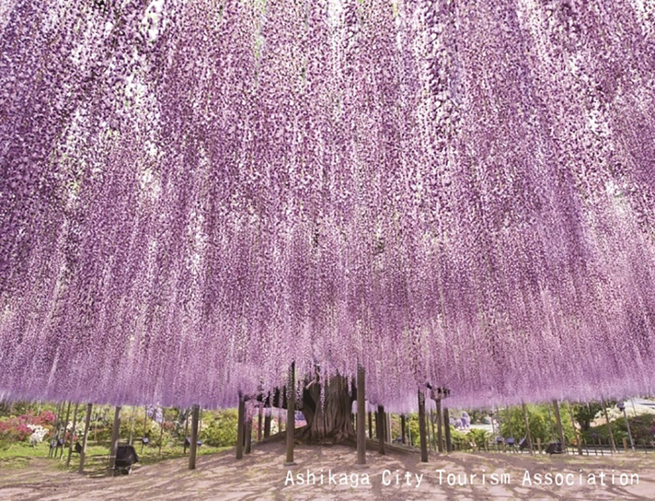 栃木県の天然記念物に指定されている樹齢160年を超える600畳敷きの藤棚を持つ大藤や、長さ80mもの白藤のトンネル、きばな藤など350本以上の藤が咲き誇ります。