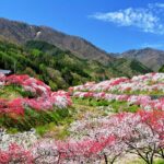 阿智村月川温泉郷『花桃の里』では、約5000本の赤・白・ピンク3色の花桃が咲き、圧巻のグラデーションをご覧いただけます。その美しさは「日本一の桃源郷」と言われています。